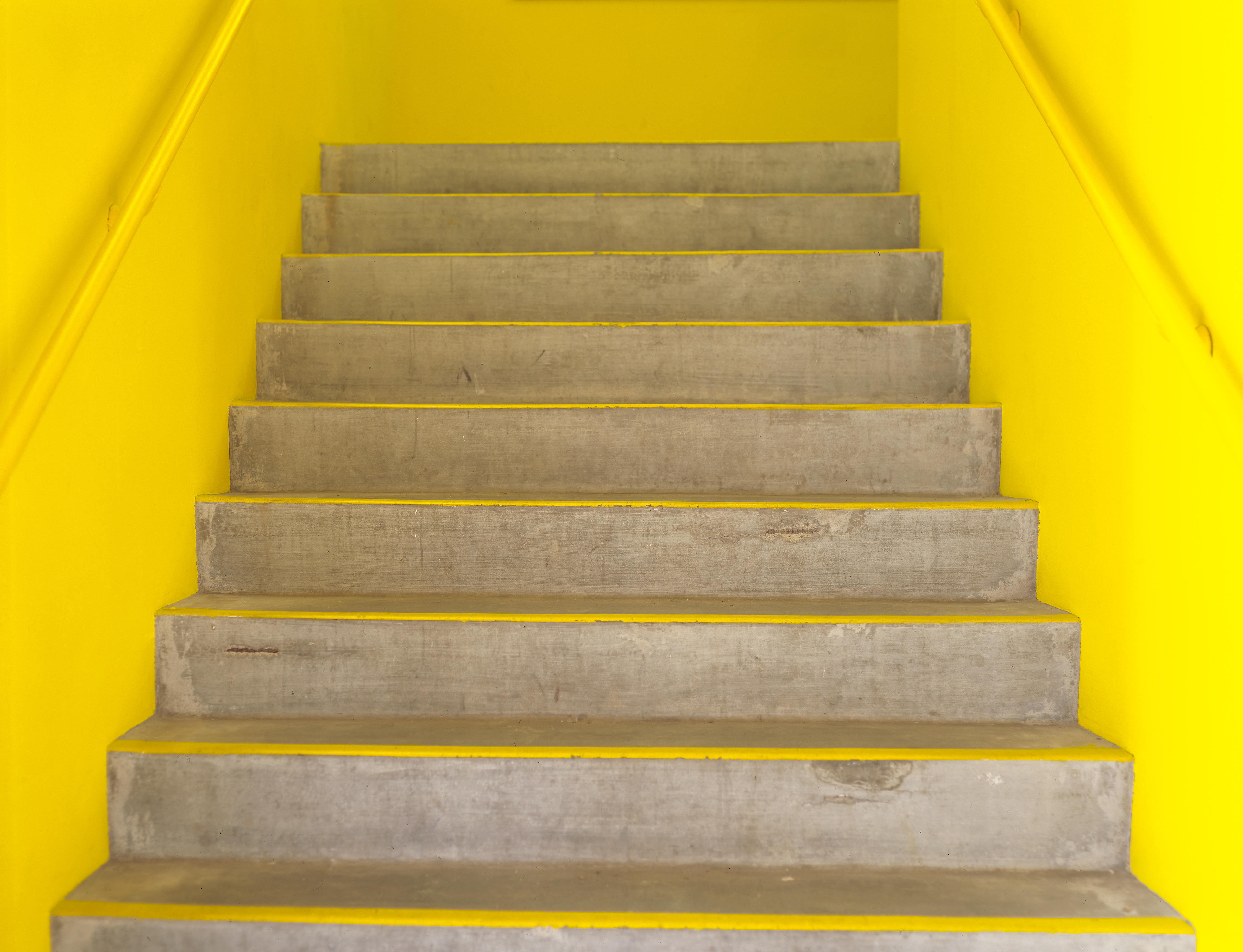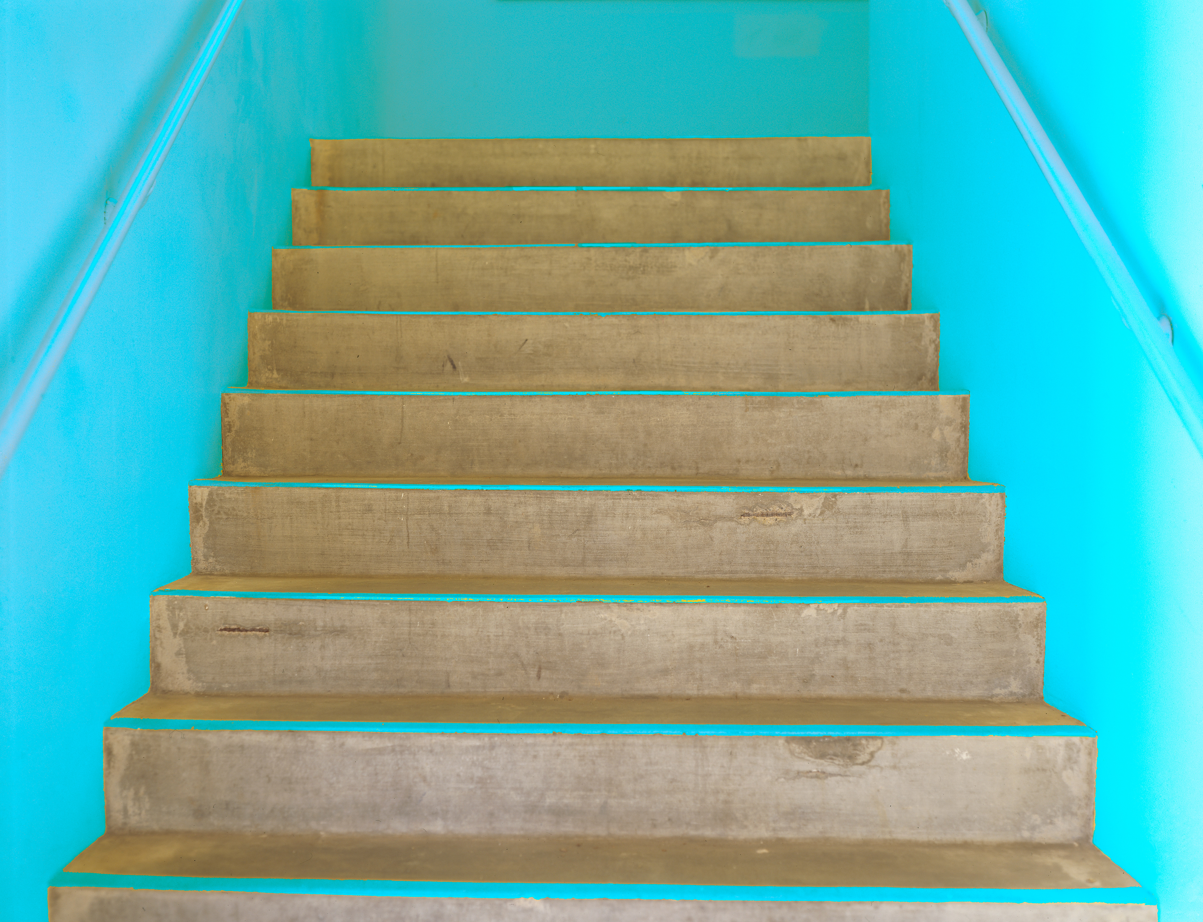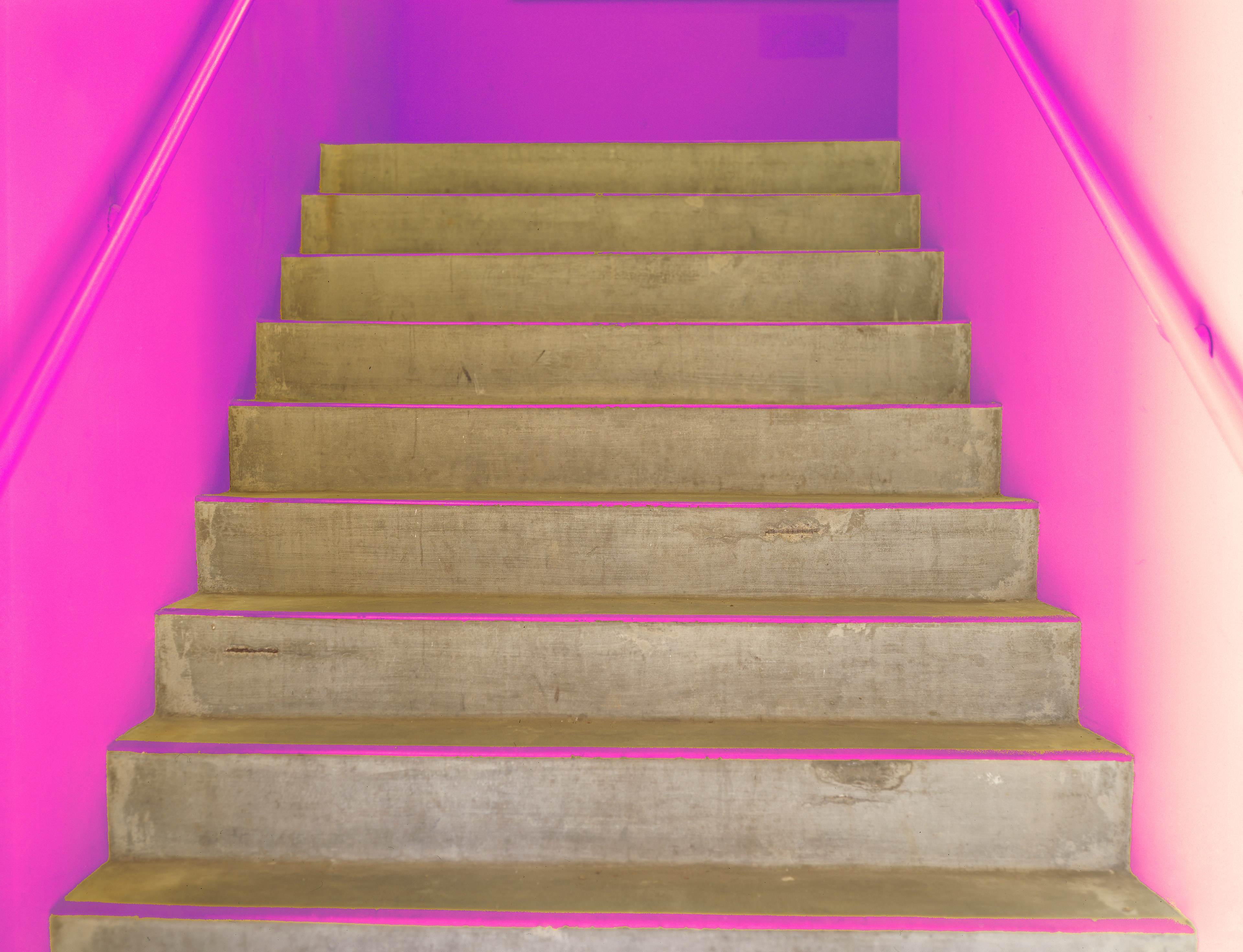 Photo series of the same stairway, considering the effects of wall color and its impact of tone and emotion to the climb, when destination is unknown.
