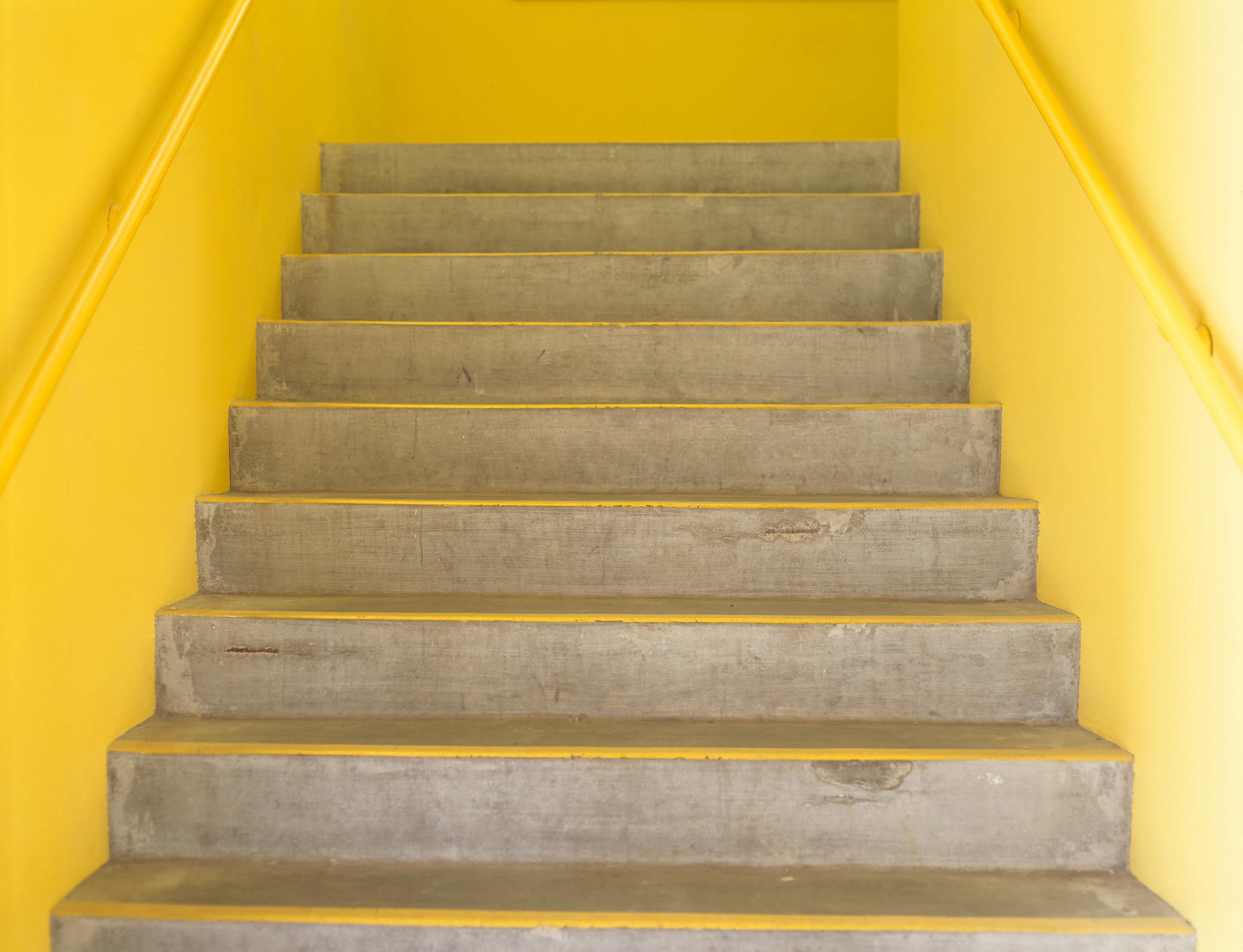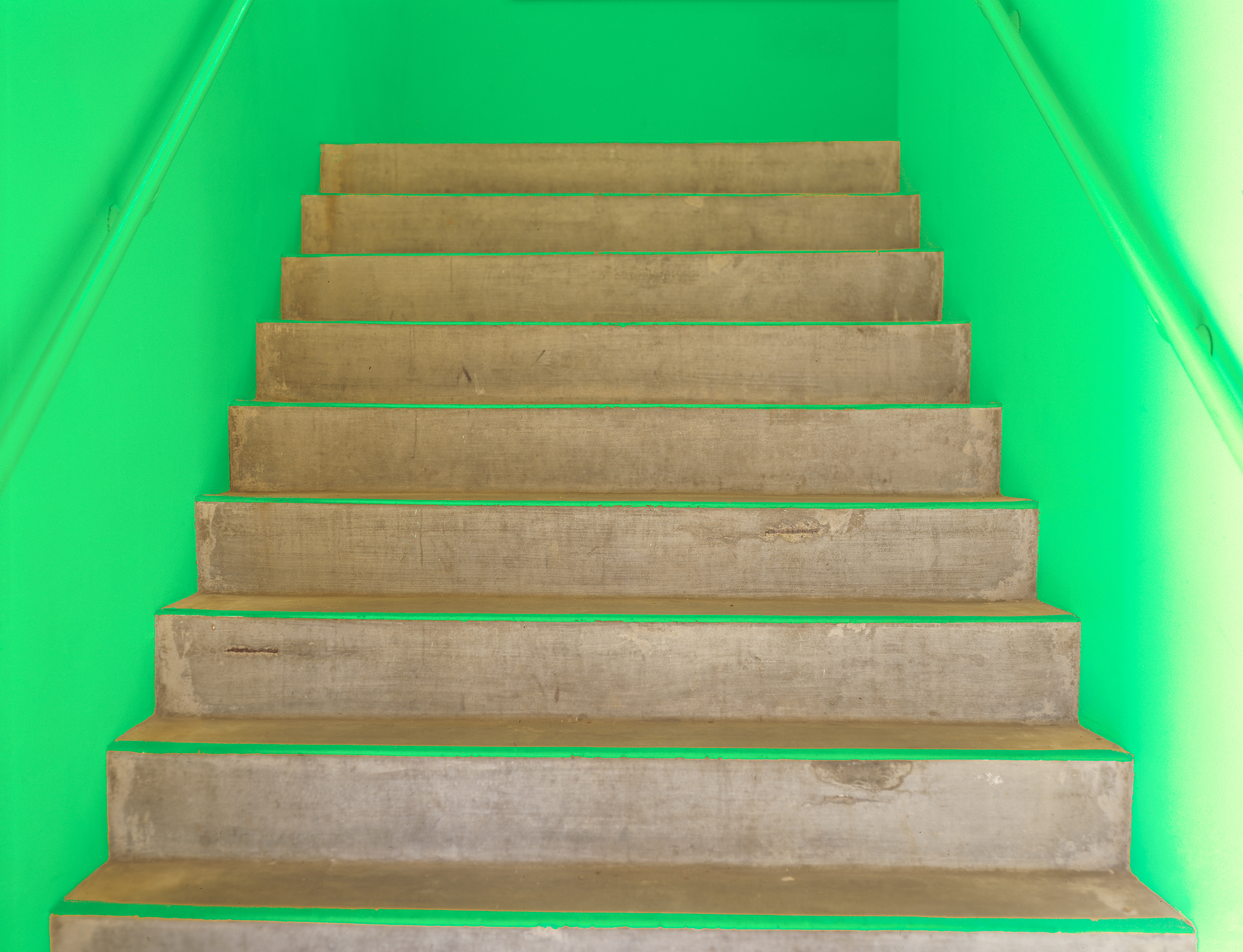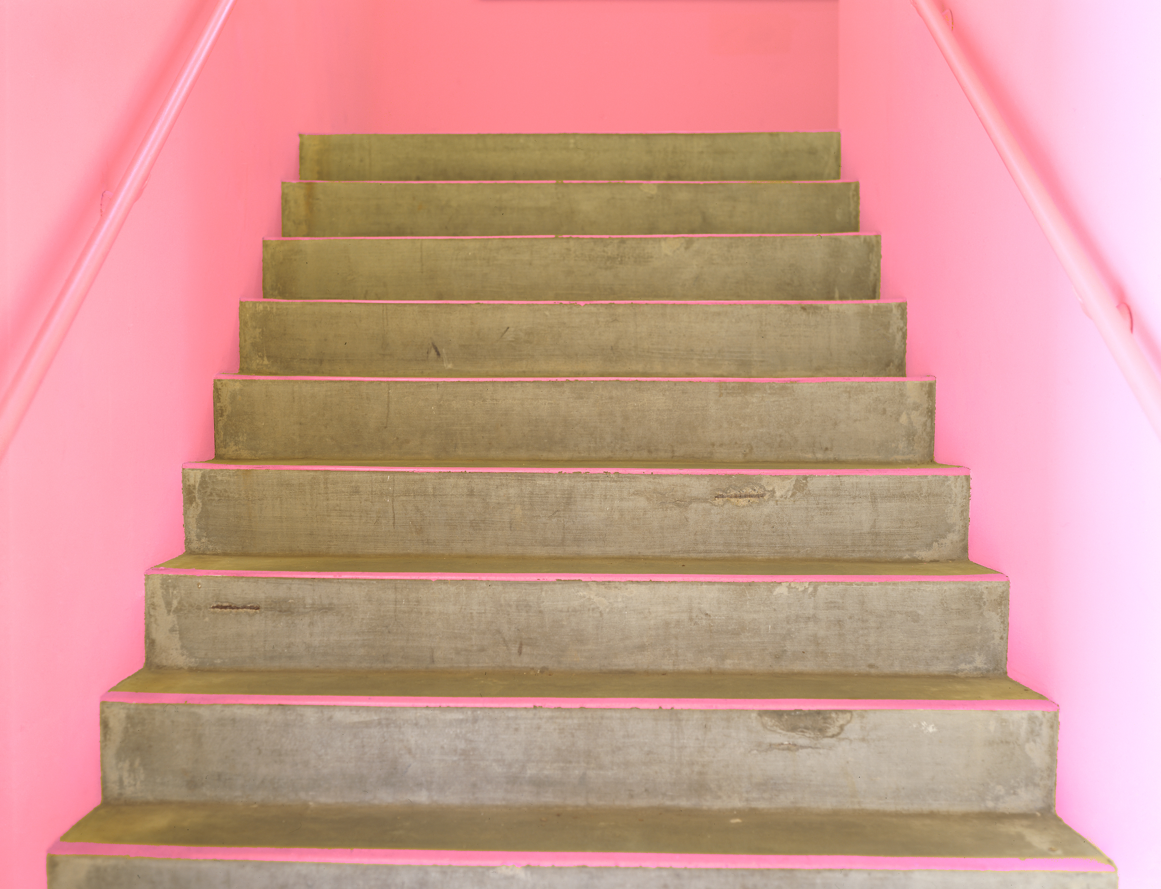 Photo series of the same stairway, considering the effects of wall color and its impact of tone and emotion to the climb, when destination is unknown.
